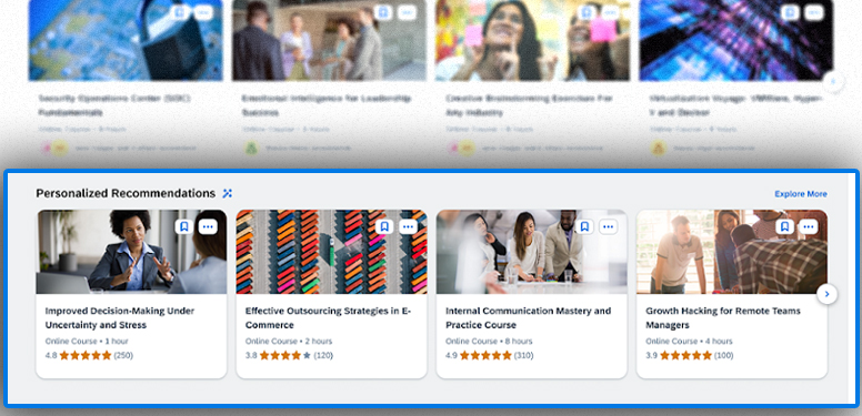 The new integrated learning experience transforms how the system delivers learning recommendations through AI-driven talent intelligence. Learners can receive personalised suggestions based on their learning history, growth portfolio, role in the company, and job role. Peer recommendations are also highlighted prominently. With machine learning algorithms, these suggestions improve over time with more usage.
