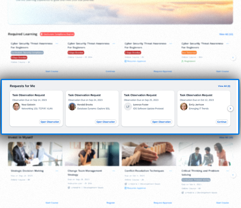 Requests for actions, like task observation, are visible in the “requests for me” section. Online course approval flows can be re-triggered if previously rejected. This structured approach and detailed assignment info help learners stay engaged and on track.
